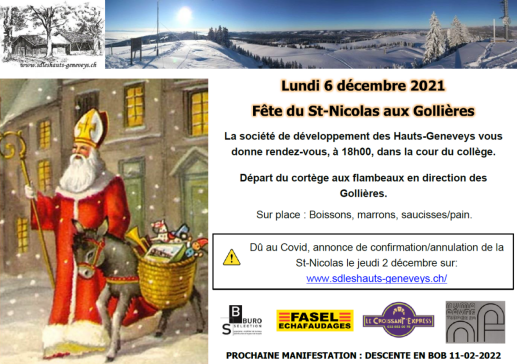 Jeudi 2 décembre: Pour l'heure, nous confirmons la tenue de la St.-Nicolas lundi. Nous mettrons à jour ce message en nous basant sur les annonces de nos autorités d'ici lundi. Veuillez s'il vous plait consulter cette page lundi.